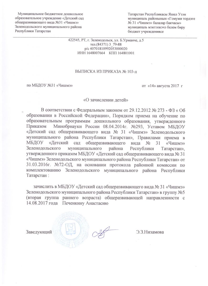 Выписка из приказа о зачислении Печенкиной Анастасии