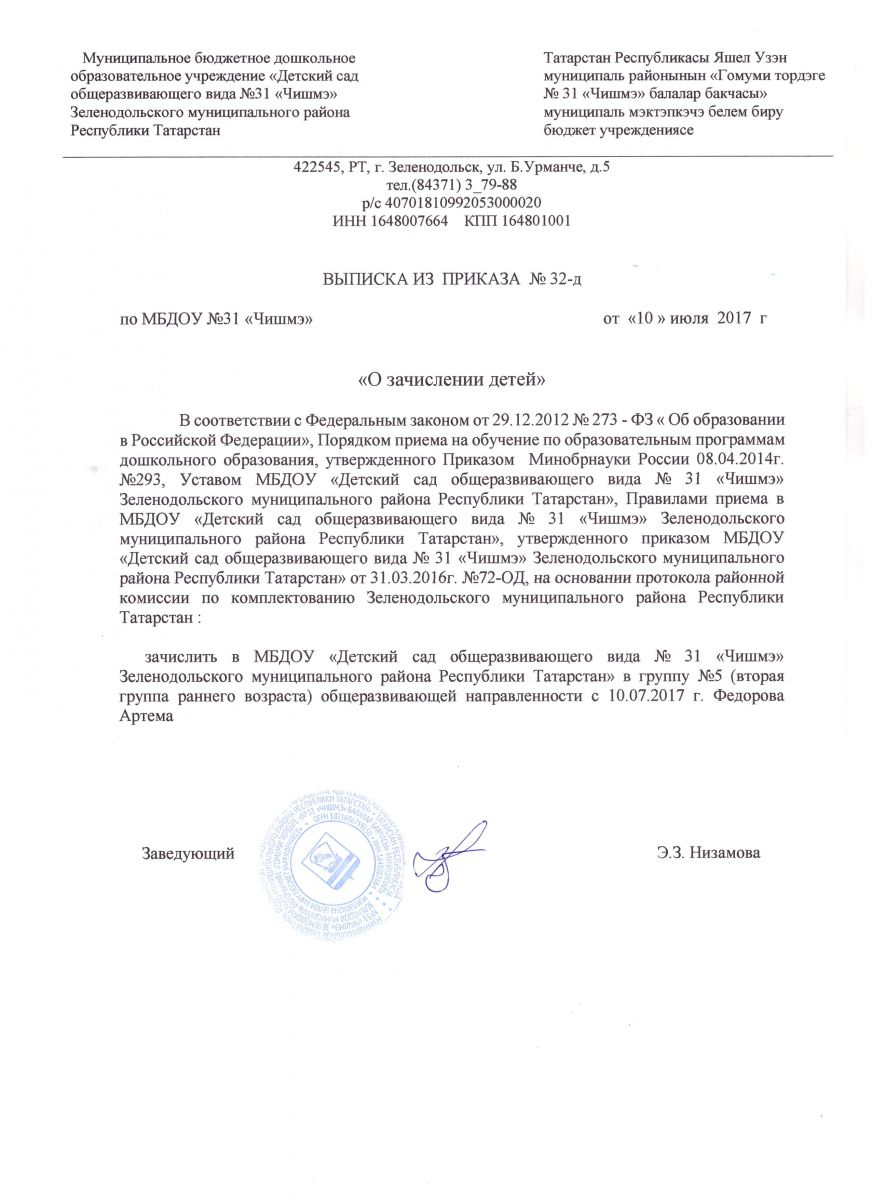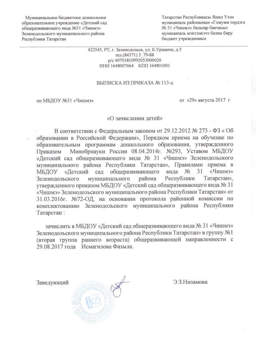 Выписка из приказа о зачислении Исмагилова Фазыла