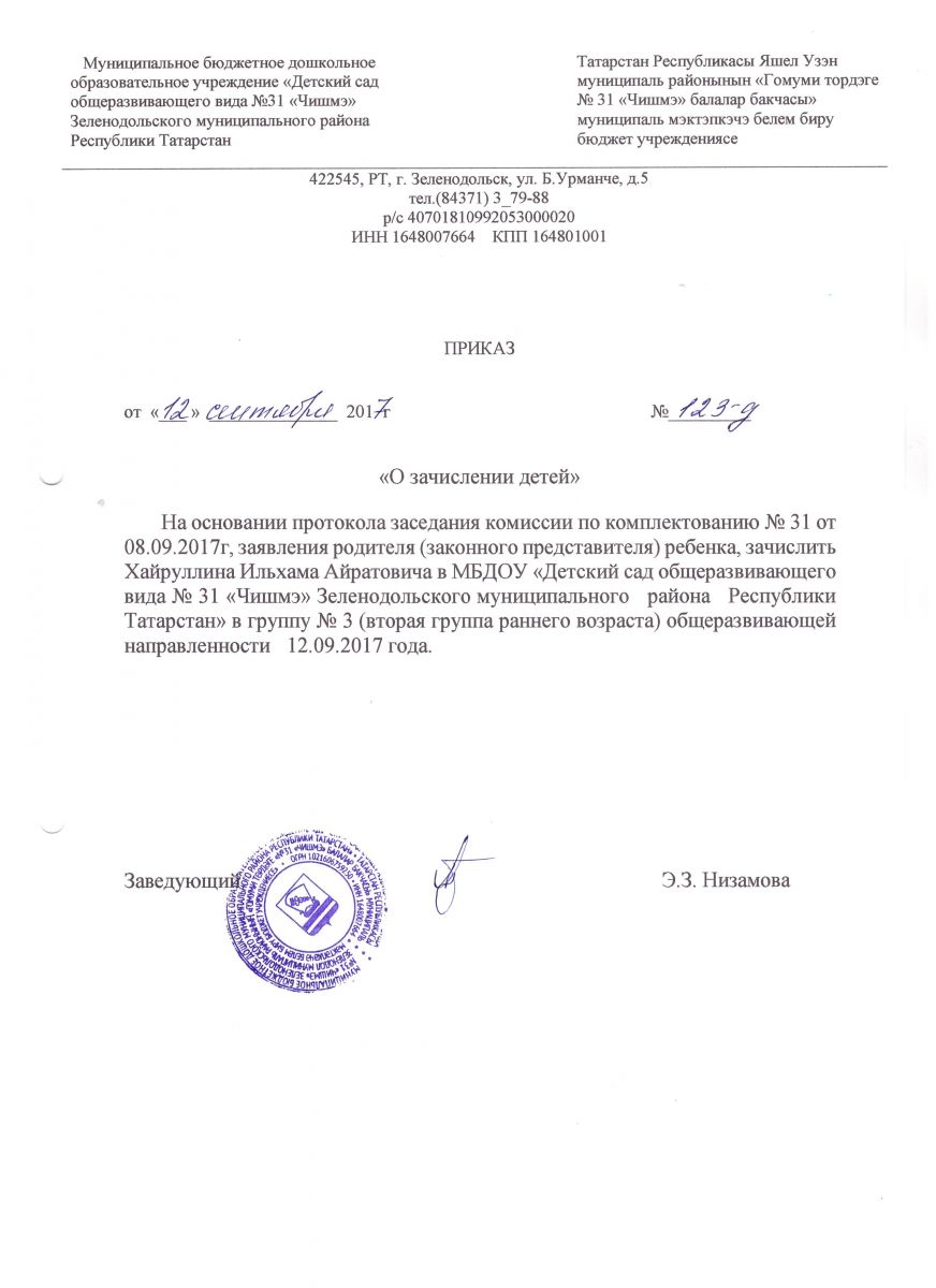 Выписка из приказа о зачислении Хайруллина Ильхама