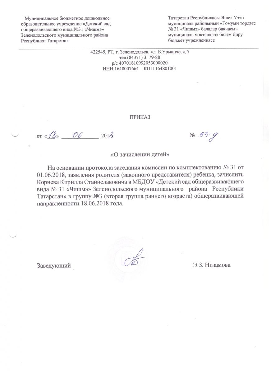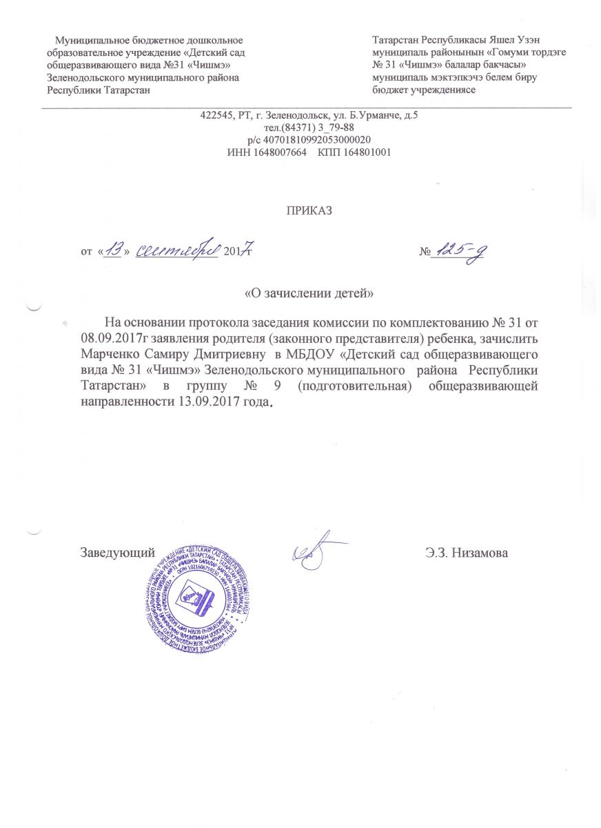 Выписка из приказа о зачислении Нигматуллина Марселя