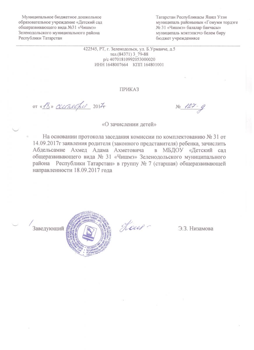 Выписка из приказа о зачислении Абдельсамие Ахмед Адам Ахмедовича