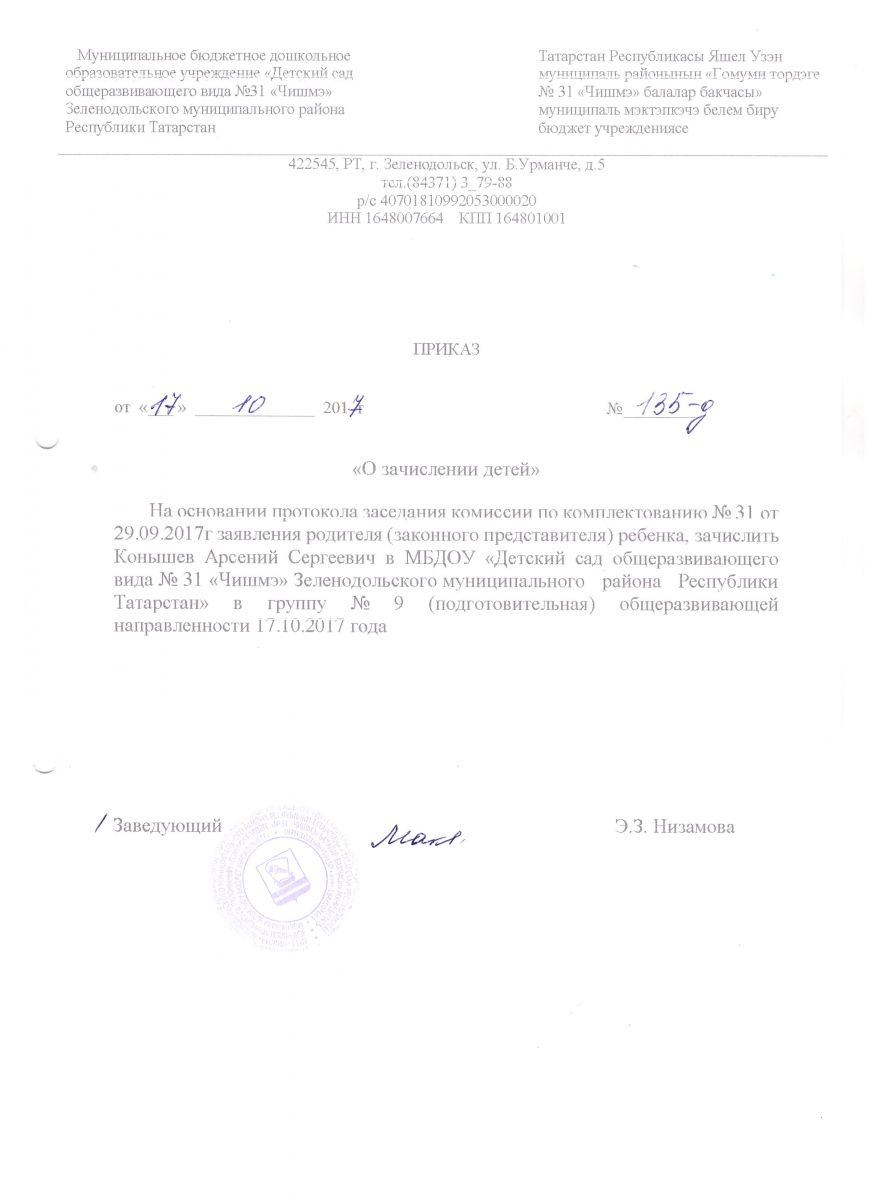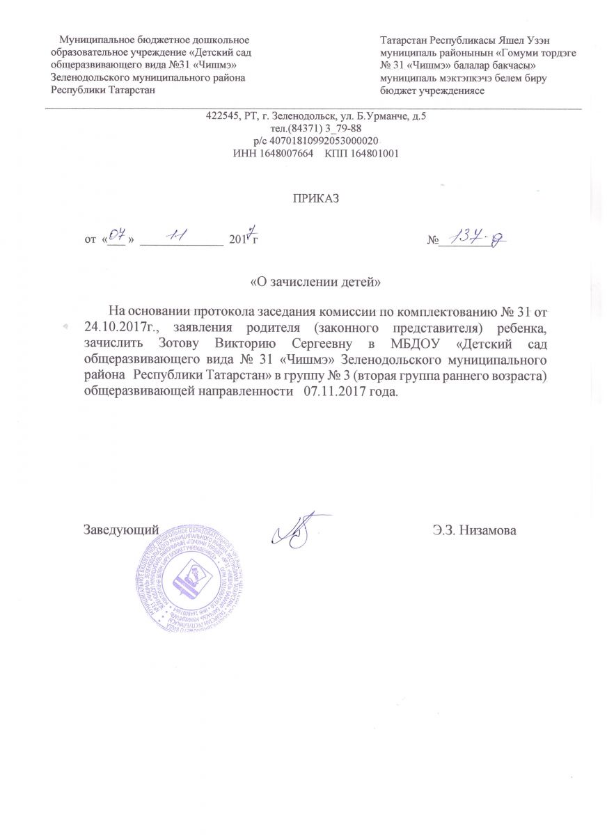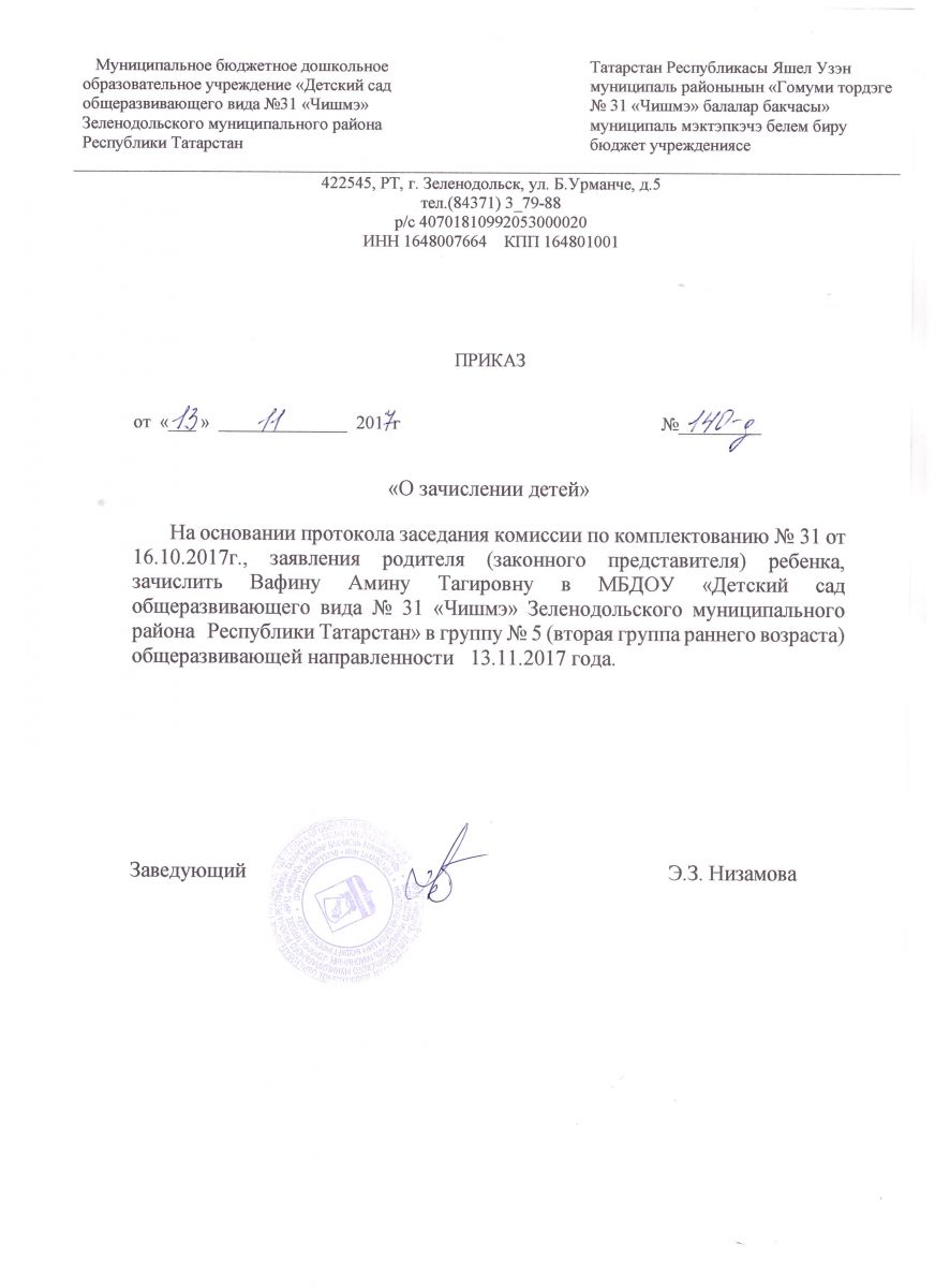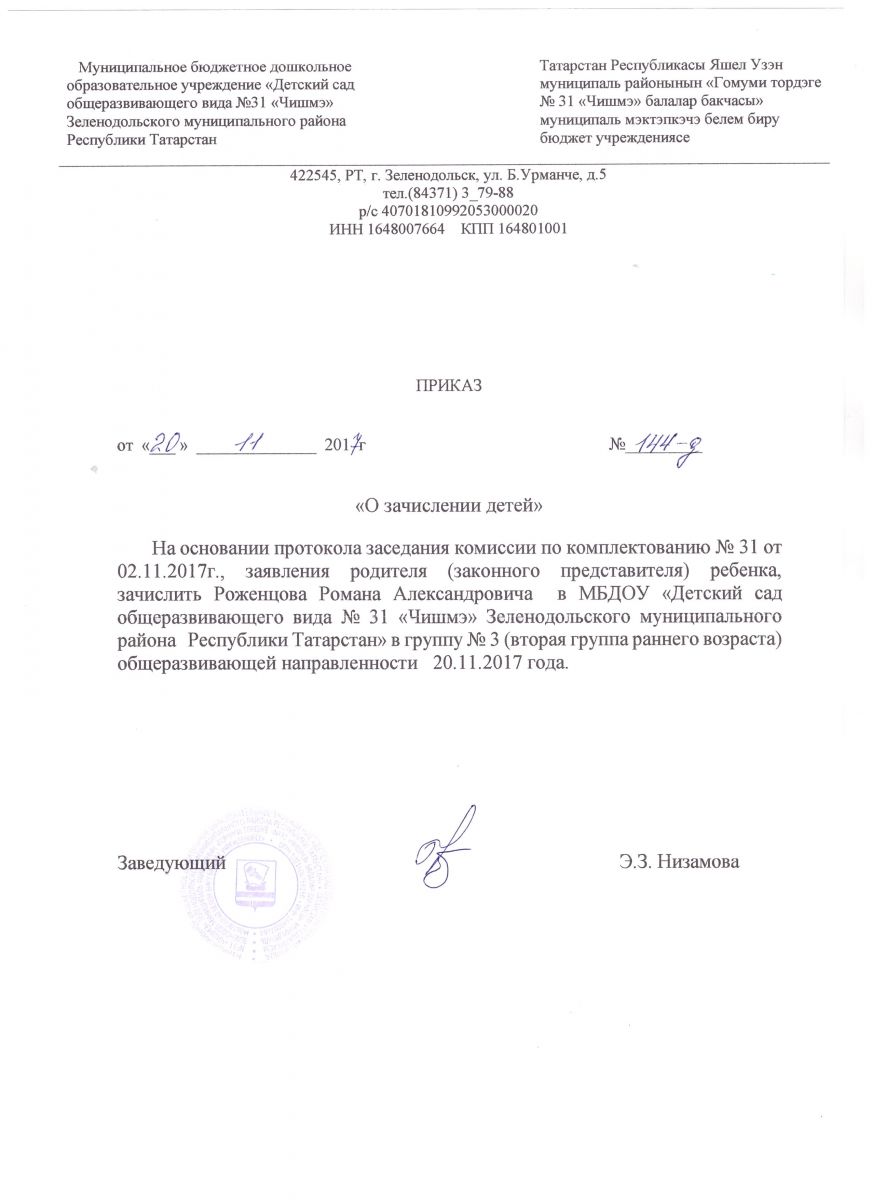 Приказ о комплектовании групп дошкольного образовательного учреждения на 2017-2018 учебный год