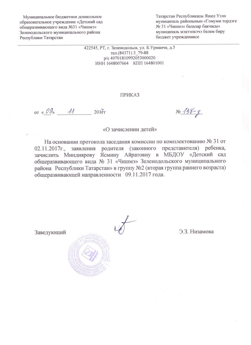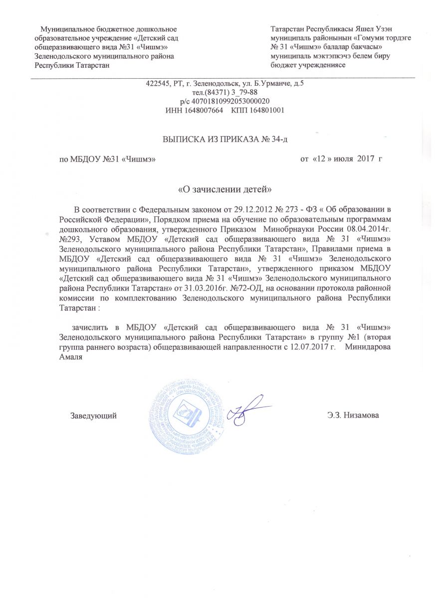 Выписка из приказа о зачислении Миндияровой Ясмины