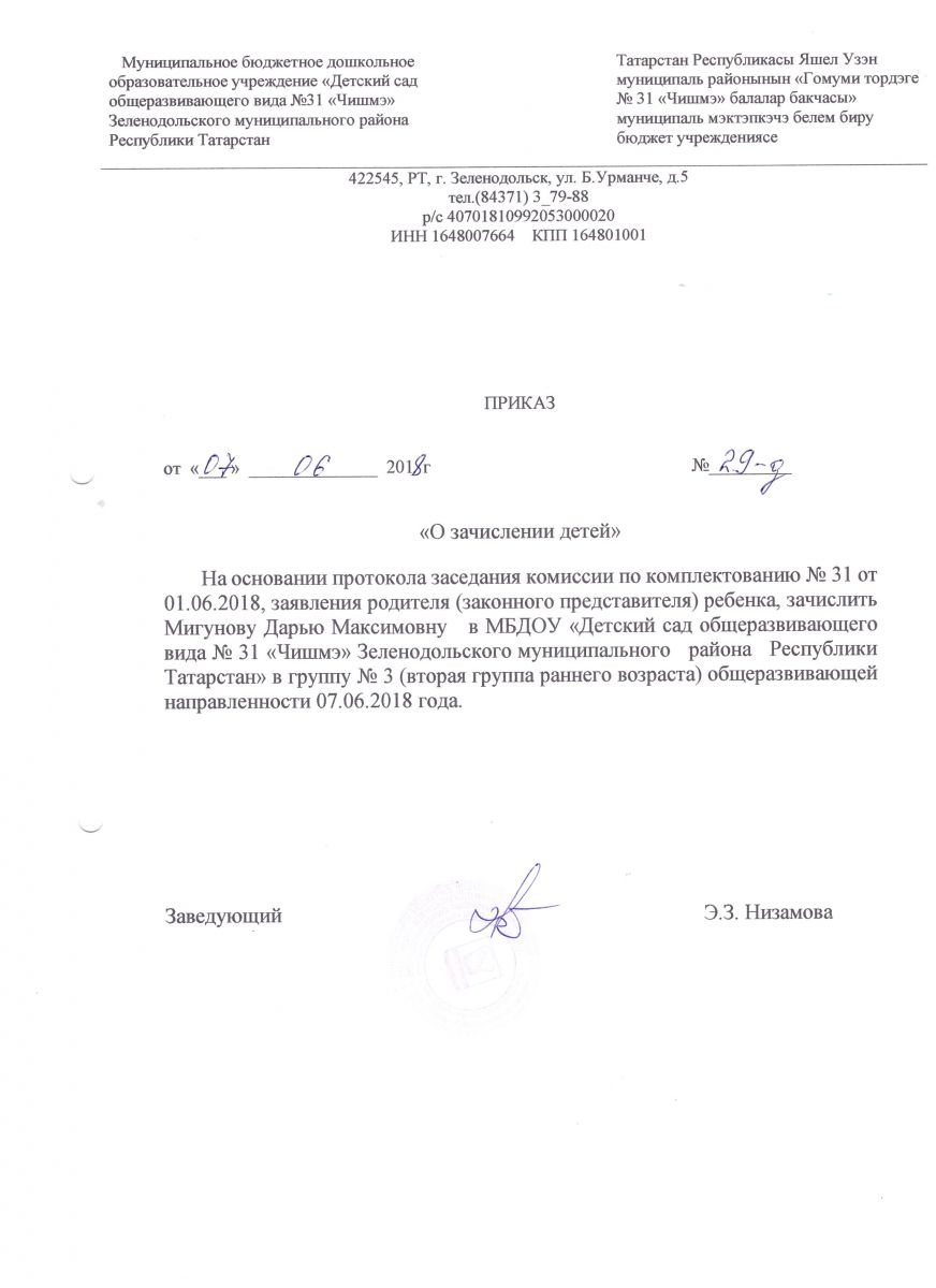 Выписка из приказа о зачислении Мигуновой Дарьи