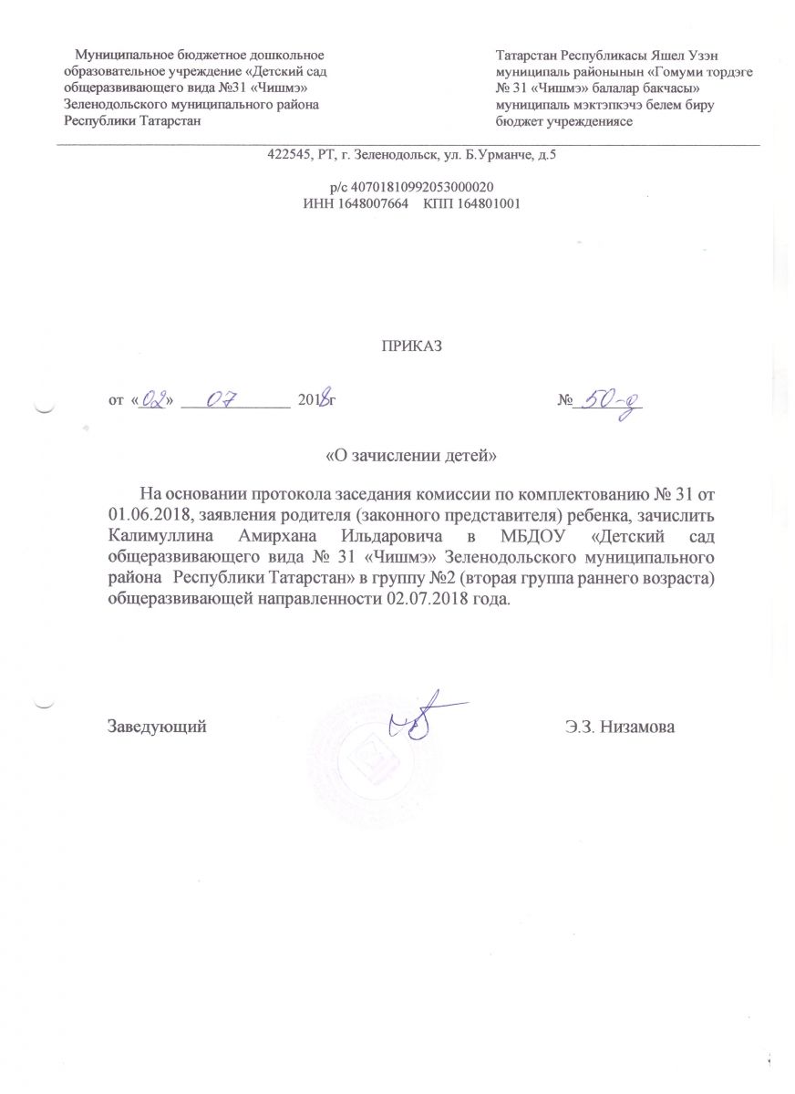 Выписка из приказа о зачислении Калимуллина Амирхана
