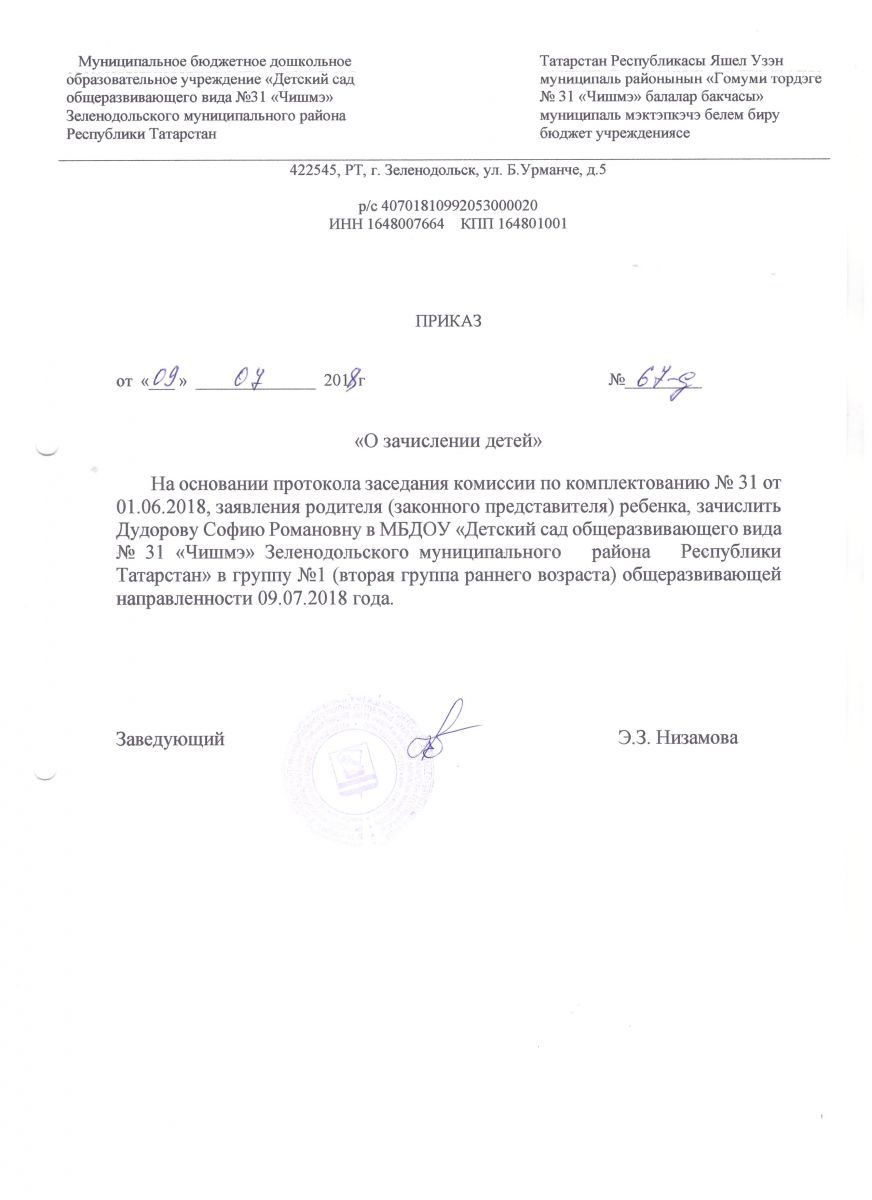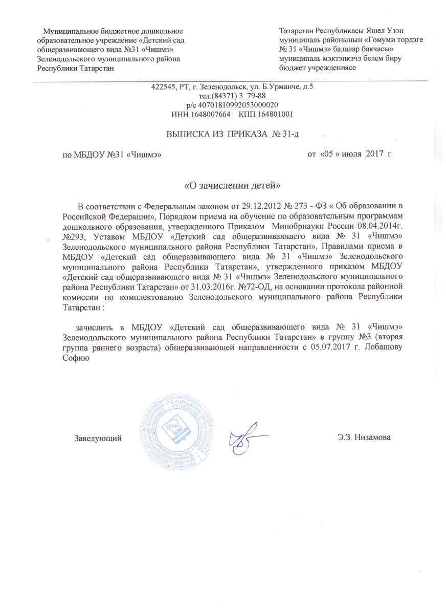 Выписка из приказа о зачислении Гиниятовой Софьи