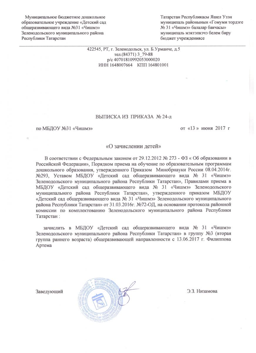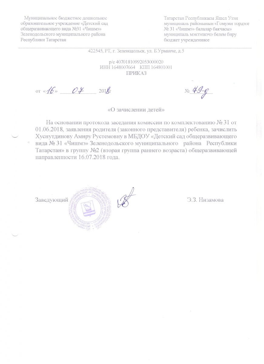 Выписка из приказа о зачислении Хуснутдинова Амира