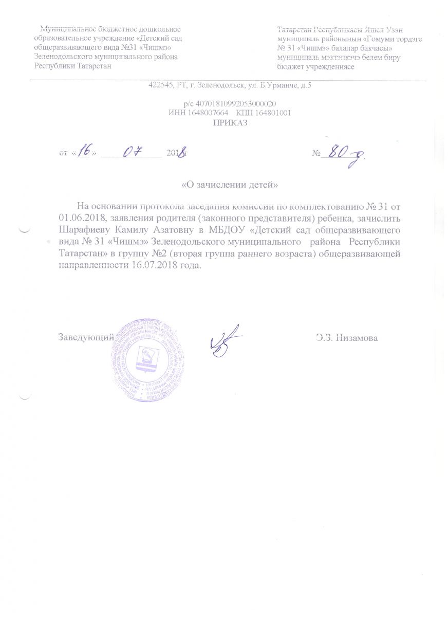 Выписка из приказа о зачислении Шарафиевой Камиллы
