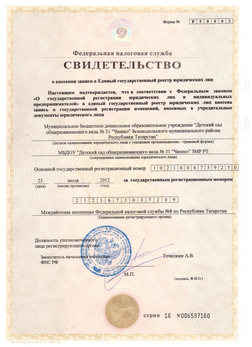 Короткое название: МБДОУ "Детский сад общеразвивающего вида №31 "Чишмэ" ЗМР РТ