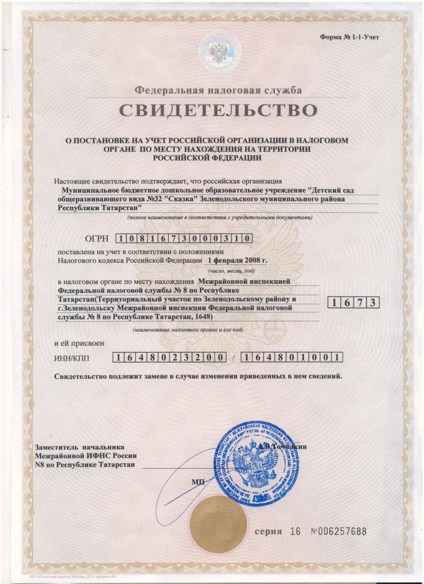 Свидетельство о постановке на учёт Российской организации в налоговом органе по месту её нахождения на территории Российской Федерации