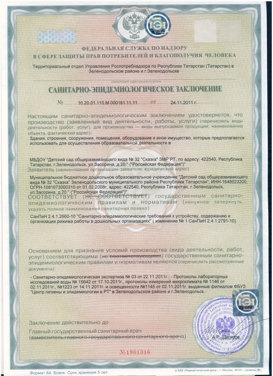 Санитарно-эпидемиологическое заключение по организации режима работы в ДОУ
