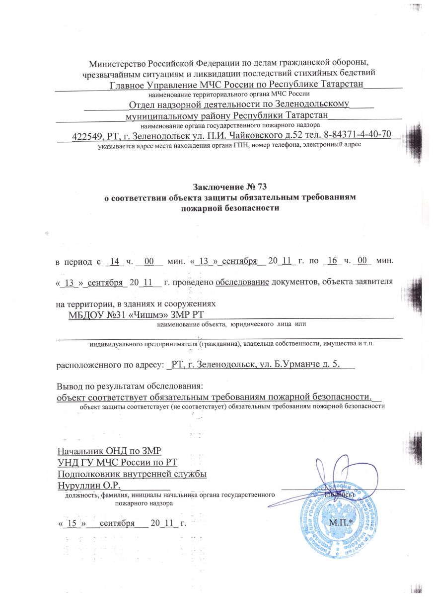 Заключение № 73 о соответствии объекта защиты обязательным требованиям пожарной безопасности
