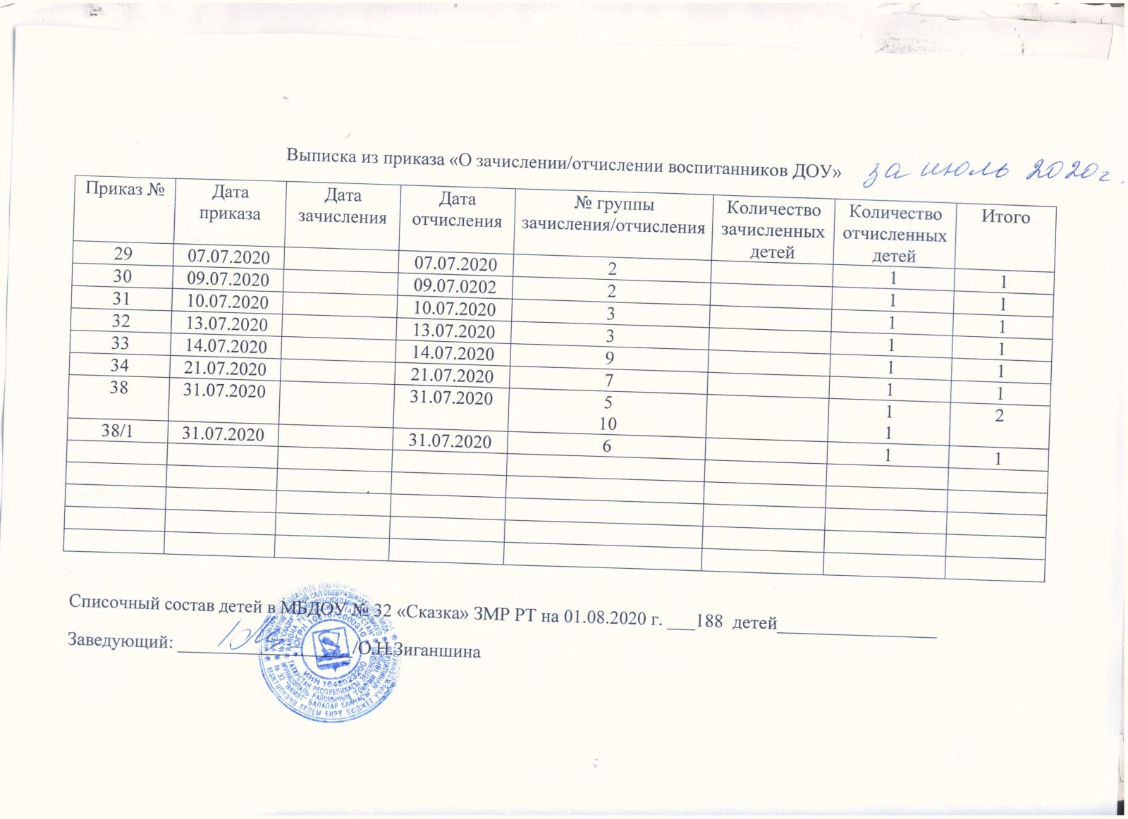 Выписка из приказов движения воспитанников от 03.08.2020 г.