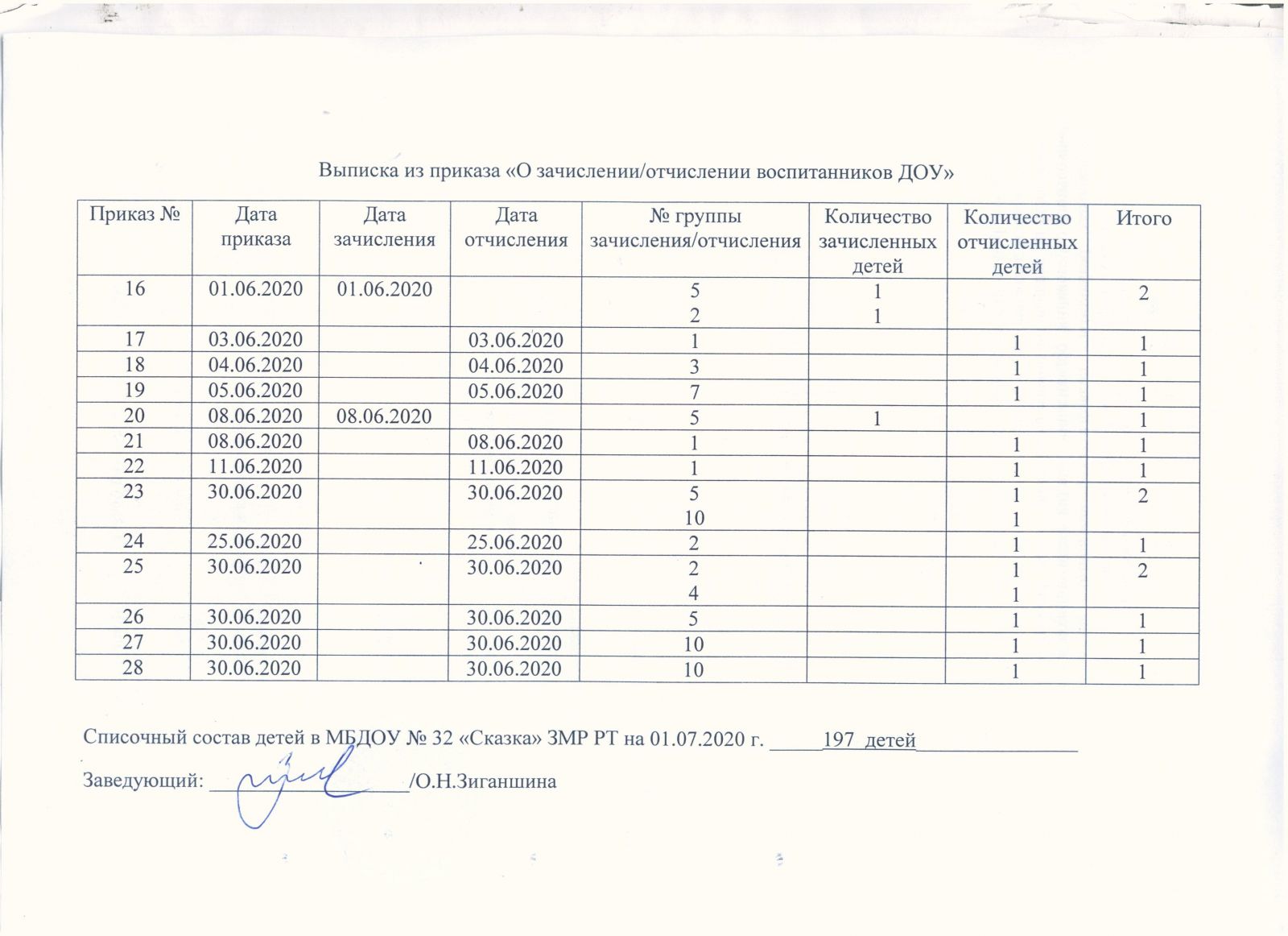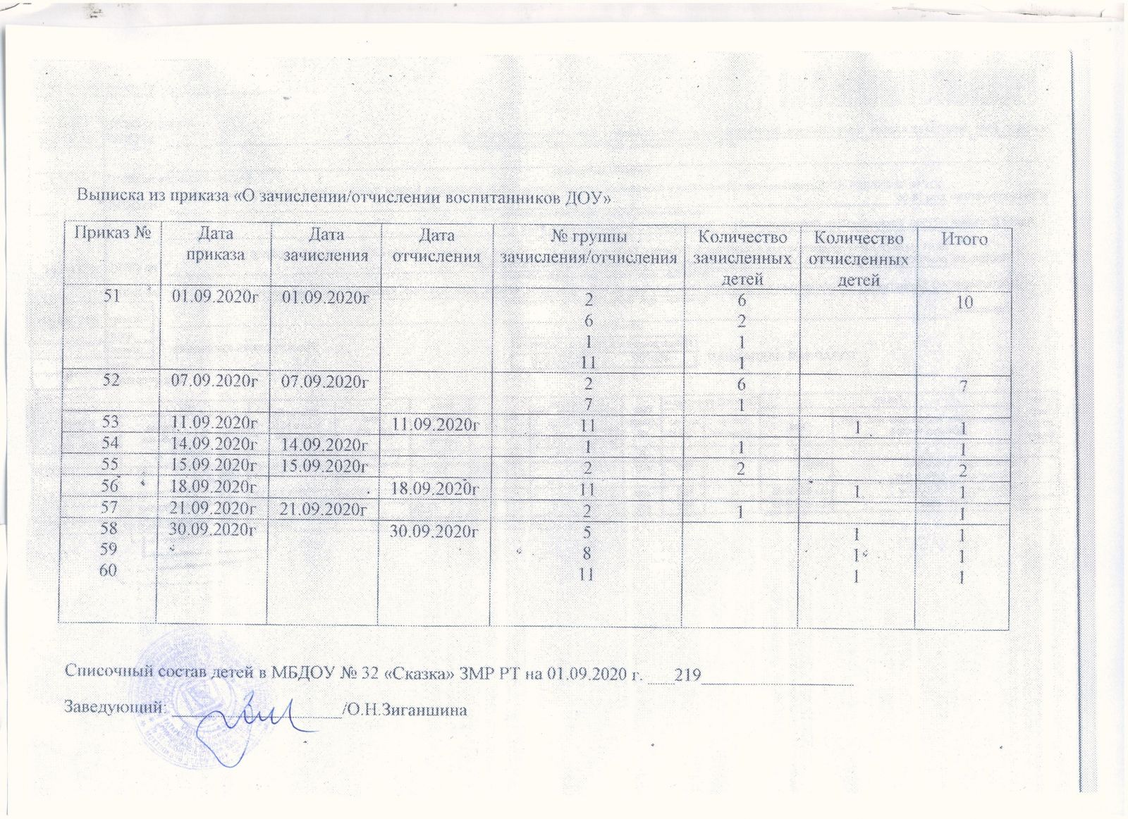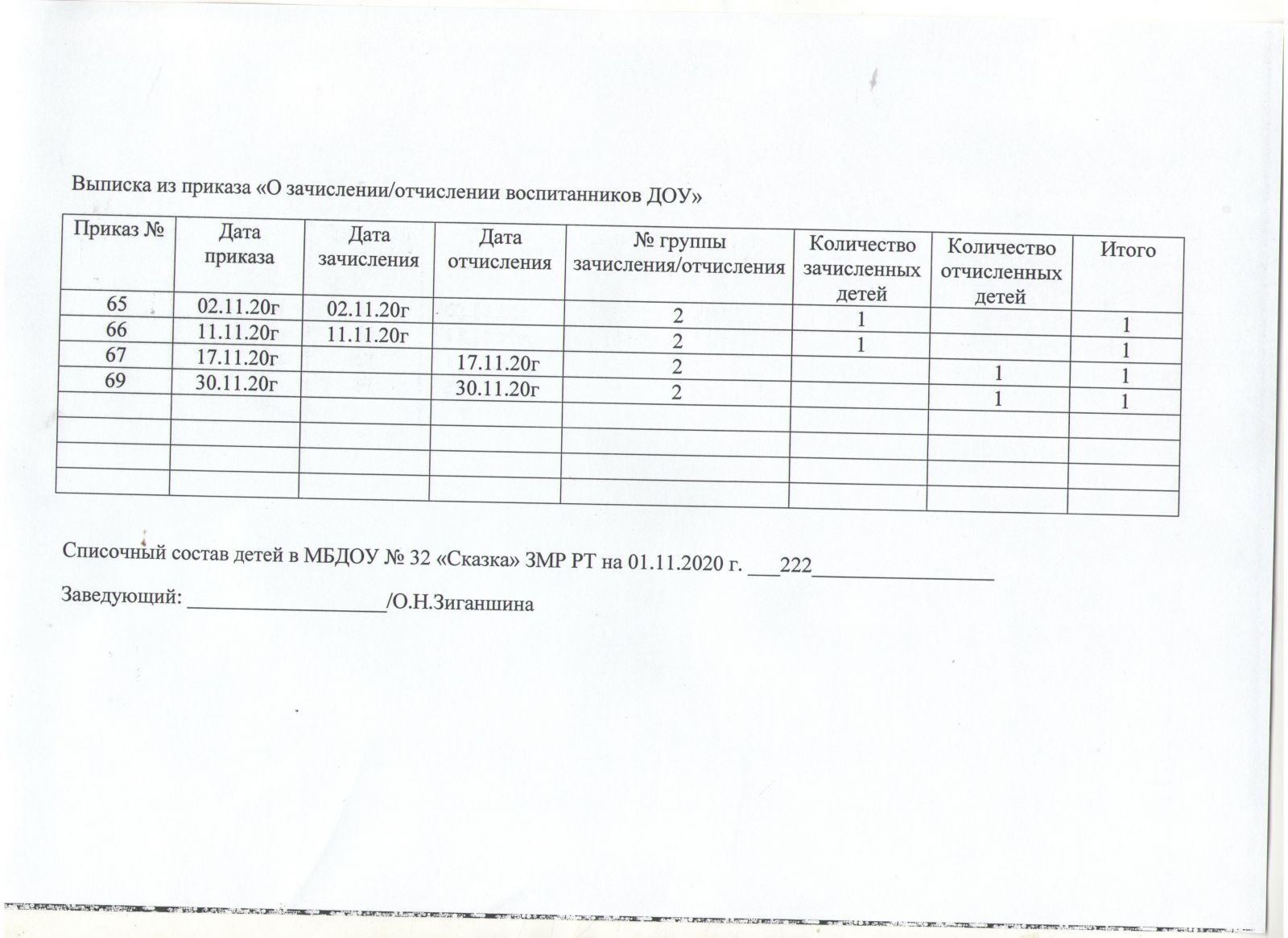 выписка из приказов движения воспитанников от 01.11.2020