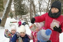 В этом году выпало очень много снега, засыпало все участки.Но наши педагоги не унывают и украшают свои участки необычными игрушками. Воспитатель средней группы Нурутдинова Альфия Равильевна предложила детям в формочки раскладывать шишки, рябину, веточки, залили все формочки водой и выставили эти формочки на мороз.Получилось очень красивое украшение, а главное дети все делали своими руками.