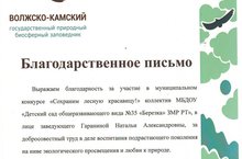 Наш детский сад принял участие в конкурсе " Сохраним лесную красавицу", организованный Волжско-Камским государственным биосферным заповедником, мы приняли участие в 3 номинациях: поделка "Лесная красавица"приняла участие семья Степанова Арсения (младшая группа) Воспитатели:Замалетдинова Э.А., Нурутдинова А.Р. и получили 3 место. Семья Ахметгараева Александра (Средняя группа)Воспитатели Якубова А.С.и Пенкина Е.В. заняли 2 место в номинации "Не рубите!" конкурс плакатов, и семья Кузьминой Софьи в номинации "Новогодние сказки" при представлении презентации воспитателем Якубовой А.С. заняли 3 место.