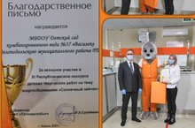 Награждение МБДОУ благодарственным письмом от АО"Татэнергосбыт" за активное участие в XI Республиканском конкурсе детских творческих работ на тему энергосбережения "Солнечный зайчик" / "Кояшлы куян" энергияне сак тоту темасына XI Республика балалар иҗат эшләре конкурсында актив катнашканы өчен"Татэнергосбыт" АҖ исеменнән Рәхмәт хаты белән бүләкләү"