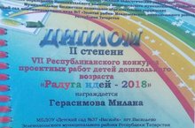 Поздравляем нашу воспитанницу Герасимову Милану с победой в IIV Республиканском конкурсе проектных работ детей дошкольного возраста «Радуга идей-2018» в номинации «Социальный проект». Молодец!!!