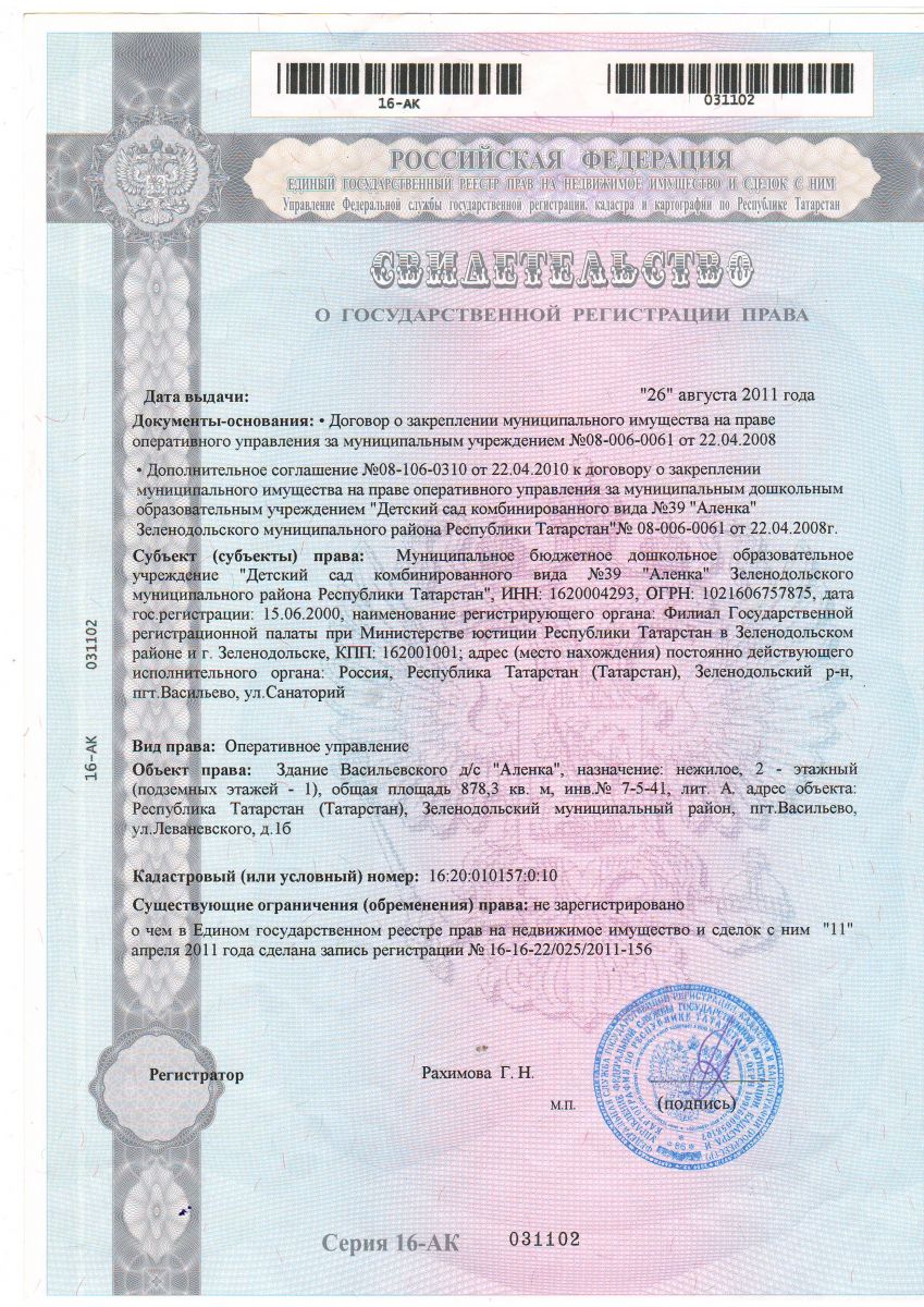 Короткое название: МБДОУ "Детский сад комбинированного вида№39 "Алёнка" ЗМР РТ