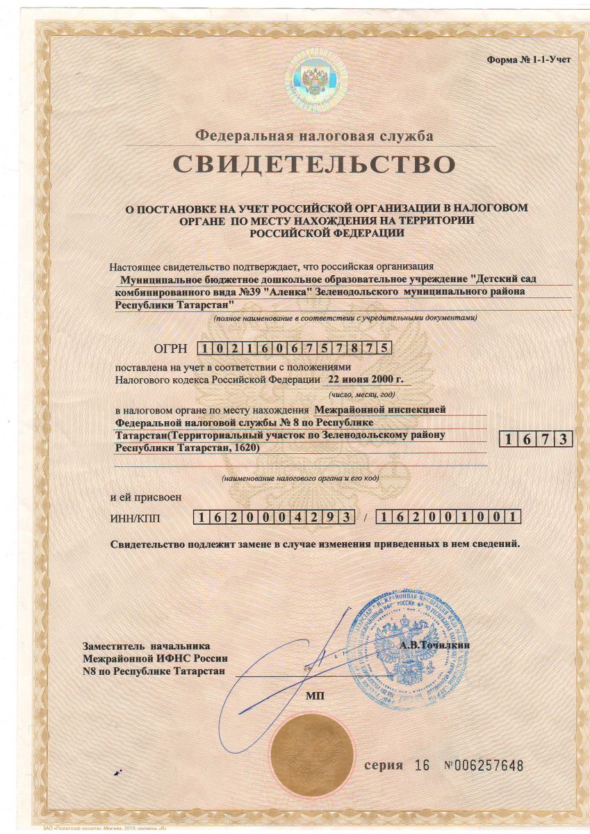 Свидетельство о постановке на учет в налоговом органе