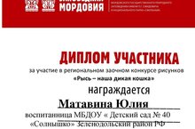 Воспитанники детского сада Юля М. и Софья С. приняли участие в региональном конкурсе рисунков "Рысь - наша дикая кошка" от Заповедника и национального парка "Смольный" - "Заповедная Мордовия". Отмечены дипломами.