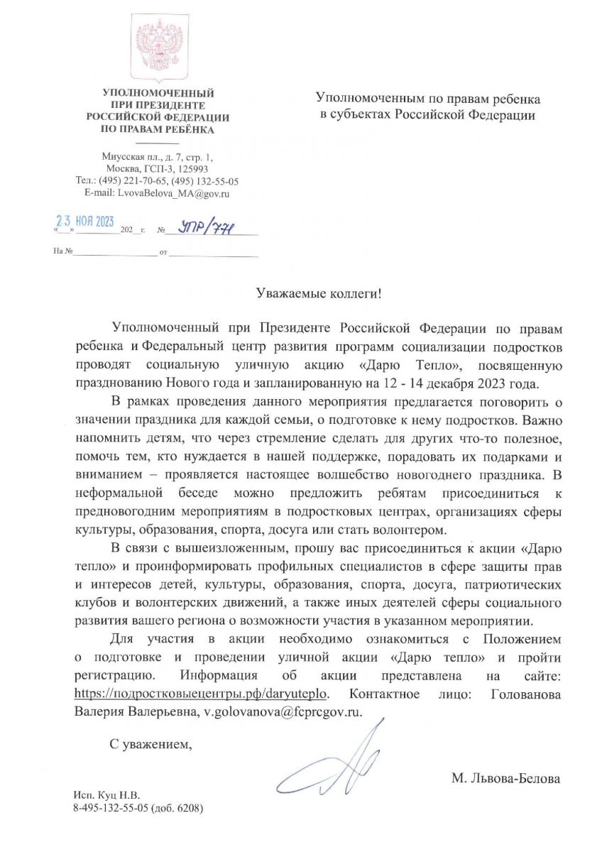 Акция #ДарюТепло была запущена Уполномоченным при Президенте РФ по правам ребенка Марией Львовой-Беловой 1 июня 2023 года, которая перешла в новогоднюю тематику.