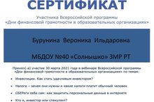 Балалар бакчасы педагоглары "Белем бирү оешмаларында финанс грамоталылыгы көннәре" Бөтенроссия программасы вебинарында катнаштылар. Катнашучы сертификаты алды.