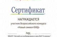 Воспитанница старшей группы - Анна Б. приняла участие во Всероссийском конкурсе "Новый символ ЮИД". Отмечена сертификатом участника.