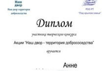 Воспитанница МБДОУ №40 "Солнышко" Бурунина А. стала Участником творческого конкурса Республиканской акции "Наш двор-территория добрососедства". Отмечена дипломом участника. Поздравляем!
