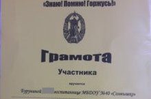 АНДРЕЙ Ш. - воспитанник МБДОУ №40 "Солнышко"принял участие в акции. 25 апреля 2019 года его рассказ о прадедушках и стихотворение прозвучали на экранах телевизоров всего района, Республики Татарстан, России. Рассказ Андрея войдет в кладезь истории нашего района. 30.04.2019г. выйдет газета "Зеленый Дол" с рассказами всех участников этой Акции. Читайте в номере. А 9 мая 2019 года в День празднования 74-годовщины Великой Победы на стадионе "Авангард" на видеоэкране еще раз Вы сможете увидеть и услышать выступления участников.ПРИГЛАШАЕМ ПРИНЯТЬ УЧАСТИЕ В ОЧНОМ НАРОДНОМ ГОЛОСОВАНИИ (на стадионе "Авангард" - 9 мая) за рисунок НАШЕЙ ВОСПИТАННИЦЫ - БУРУНИНОЙ А. в тематике "ЗНАЕМ! ПОМНИМ! ГОРДИМСЯ!".