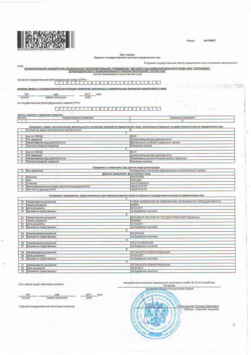 Лист записи Единого государственного реестра юридических лиц - МБДОУ №40 "Солнышко"