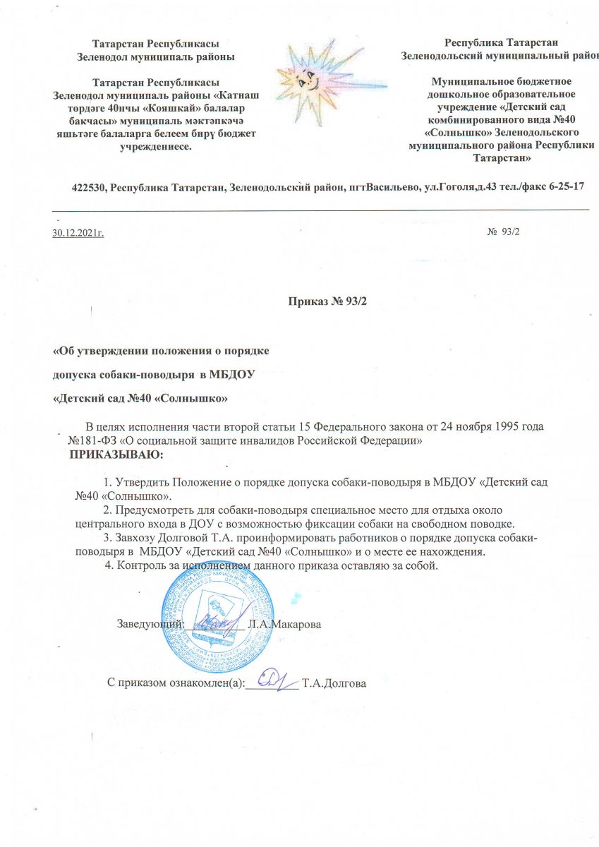Приказ "Об утверждении положения о порядке допуска собаки - поводыря в ОО"