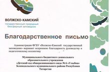 Администрация ФГБУ "Волжско-Камский государственный заповедник" выражает искреннюю благодарность руководству и педагогическому коллективу МБДОУ "Детский общеразвивающего вида №6 "Улыбка" ЗМР РТ за активное участие в первом этапе "Творческое волонтерство на благо заповедника!" республиканского конкурса детского рисунка и творческих работ "Заповедная природа Республики Татарстан".