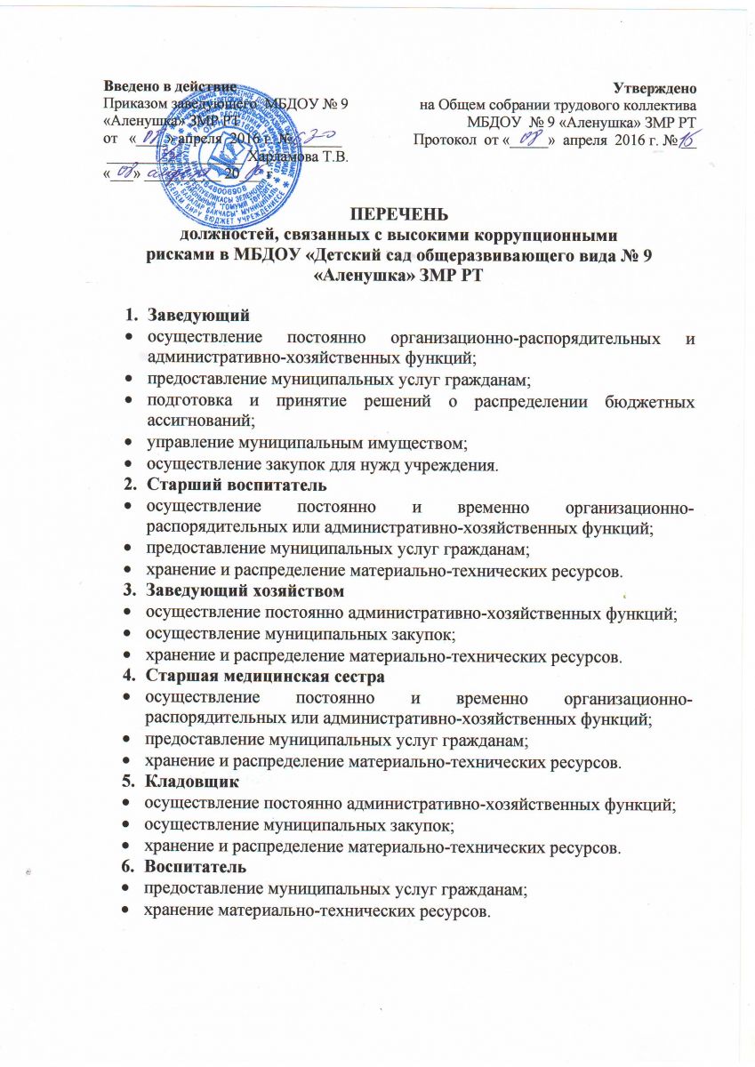 Перечень должностей, связанных с высокими коррупционными рисками.