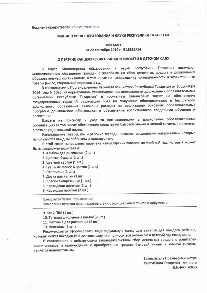 Письмо МО и НРТ "О перечне канцелярских принадлежностей в детском саду"