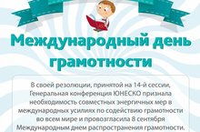 8 сентября отмечается Международный день распространения грамотности, установленный по инициативе ЮНЕСКО. В школе традиционно прошли мероприятия, посвящённые этой дате, призванной привлечь внимание общественности к проблеме неграмотности. Девизом Дня грамотности стали слова: «Быть грамотным необходимо в нашем веке! Долг каждого - грамотно писать». Учащиеся школы писали словарные диктанты, диктанты текстовые, демонстрировали свое знание орфографии и пунктуации. В каждом классе самые грамотные ученики получили «5» по русскому языку.