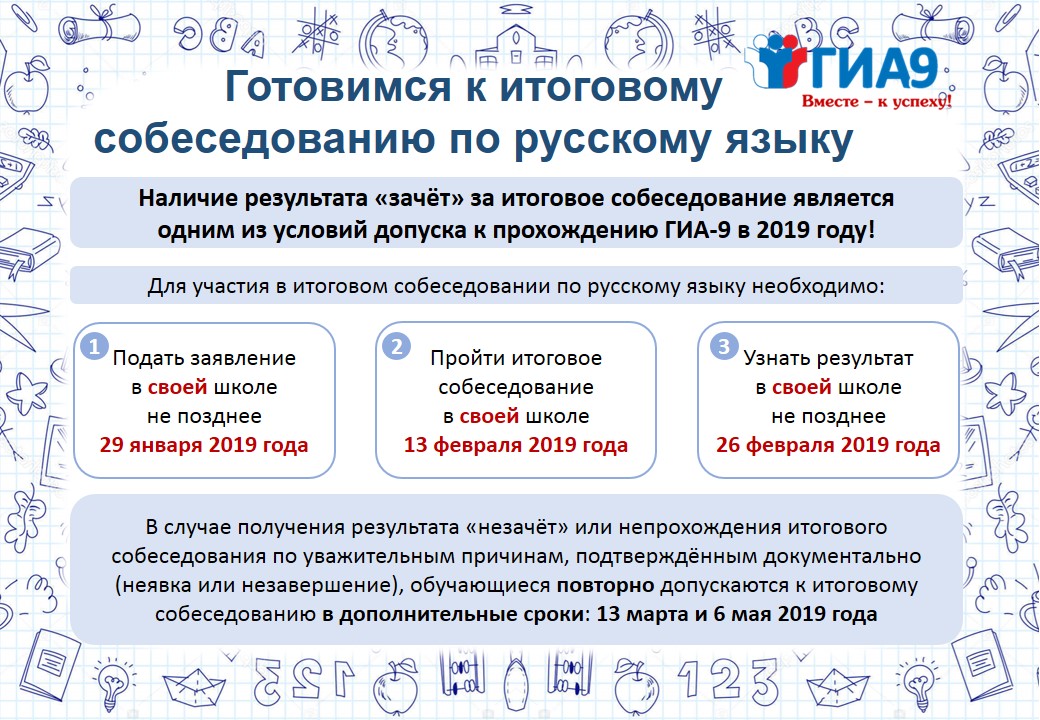 13 февраля 2019 года для обучающихся 9 класса и экстернов проводится итоговое собеседование по русскому языку.