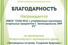 27 февраля 2017 года учащиеся нашей школы приняли участие в проекте «Всероссийский заповедный урок», реализуемый ЭкоЦентром «Заповедники» в рамках программы «Движение друзей заповедных островов». Чумакова Т.Н. (учитель биологии) и Морозова Н.Е. (учитель географии) провели серию Всероссийских Заповедных уроков, посвященных 100-летию заповедной системы.