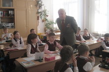 После смотра песни и строя Николай Петрович Лазарев беседовал с учениками 2А класса. Он рассказал ребятам о войне и отвечал на вопросы, которые задавали дети.