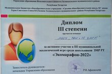 Руководитель: Нотфуллина Л.Г.12 майда 8 сыйныф укучылары командасы "Экомарафон - 2022"III муниципаль экологик уенының 3 дәрәҗә дипломына ия булды. Уен барышында балалар гаҗәеп табигать дөньясында булдылар, әйләнә-тирә дөньяның матурлыгына инандылар. Һәм тагын бер тапкыр табигатьне саклау кирәклеге турында уйландылар.