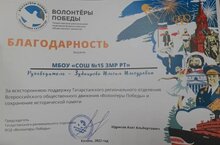 "Җиңү волонтерлары" отряды җитәкчесе Зөбәирова Илсөя Илсур кызы - "Җиңү волонтерлары" Бөтенроссия иҗтимагый хәрәкәтенең Татарстан төбәк бүлегенә һәрьяклы ярдәм күрсәткәне һәм тарихи истәлекне саклаган өчен рәхмәт хаты белән бүләкләнде.
