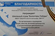 Благодарственным письмом награждён отряд "Волонтёры Победы" (6 класс) за организацию и проведение акций, квестов, интеллектуальных игр и патриатическую деятельность в Зеленодольском районе.
