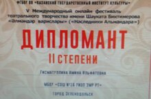 Ученица 1 А класса Гисматуллина А. (учитель Гисматуллина Г.Н.) приняла участие в V – международном онлай фестивале театрального творчества Имени Шауката Биктимерова “Әлмәндәр варислары”