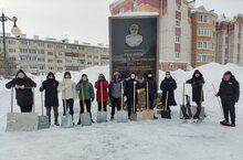 Участники акции - отряд Юнармии , вооружившись лопатами и щетками, с энтузиазмом приступили к очистке памятника от снега.