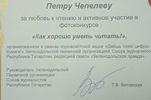 Сегодня за активное участие в фотоконкурсе "Как хорошо уметь читать!", организованном редакцией газеты "Зеленодольская правда", награжден грамотой Чепелев Петр, ученик 1 класса.