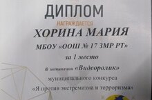 Поздравляем ученицу 9 класса Хорину Марию, победившую в муниципальном конкурсе "Я против экстремизма и терроризма", в номинации "Видеоролик".Так держать!.
