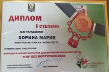 Поздравляем Хорину Марию, победувшую в муниципальном конкурсе детско-юношевского конкурса "Мир без коррупции-2022", в номинации видеоролик. Молодец! Так держать!