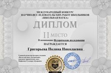 Поздравляем Григорьеву Полину, занявшую 2 место в Международном конкурсе научно-исследовательских работ школьников "Школьная наука" в номинации "Исторические исследования". Руководитель Маршалова И.Н.
