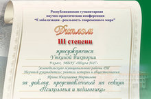 Поздравляем Уткину Викторию, занявшую 3 место в Республиканской гуманитарной научно-исследовательской конференции "Глобализация- реальность современного мира" в номинации "Психология и педагогика". Руководитель Маршалова И.Н.