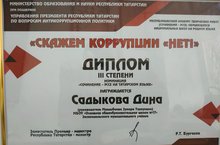 Администрация школы, от всей души, поздравляет ученицу 9 класса Садыкову Дину и учителя татарского языка Миндибаеву З.Т., ставших призерами республиканского конкурса сочинений-эссе на татарском языке "Скажем коррупции "Нет!". 5 декабря в Казанском Кремле состоялось торжественное награждение победителей. Молодцы!